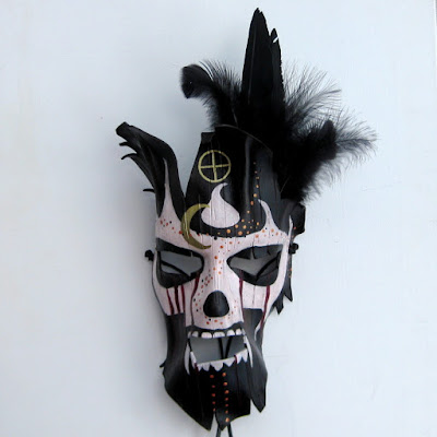 This mask looks too aggressive to me, although, I like the detail which is painted over such as the moon, red dots and circle with a cross in the middle. Lines arising from slots are representing the blood coming out of the eyes. I exclude this in my own design as my character is not going to have a creepiness aspect even if he is a Voodoo doll. The shape of the mask has a nice, defined forms. If I will use feathers for the mask, I will probably have to use Alpha channels, Although we have to create a low-poly character so I might have the mask with no additional moving detail.